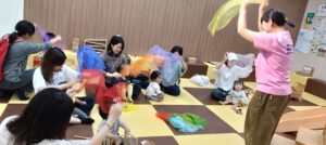 「チョロチョロ」「ドボドボ」などの声に合わせて、布を大きく・小さく揺らし、空間を感じる遊びも行いました。(お家ではティッシュでも代用できますよ♪)