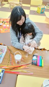 4歳のお子さんは紙コップにたくさんシールを貼って、とても上手にハロウィンバケツを完成させ、嬉しそうにスタッフに見せてくれました。