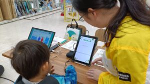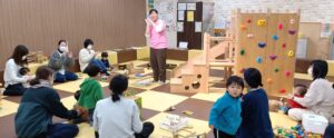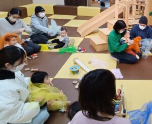 2歳以下のこどもたちが多く、それぞれ好きなあそびを楽しんでいましたが、中には「どうぞ」とおもちゃを渡す姿も見られ、微笑ましい時間となりました。
