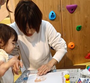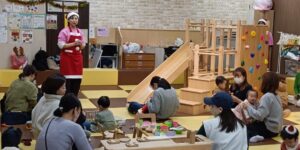 ママたちが一生懸命作っているあいだ、お子さんたちはママと少し離れて木のおもちゃで遊んだり、ママのそばに行ったりと、それぞれ自由に過ごしていました。