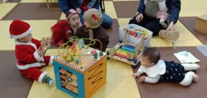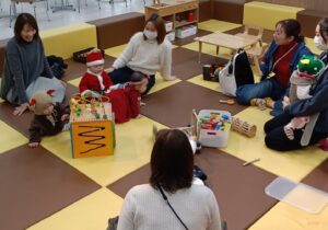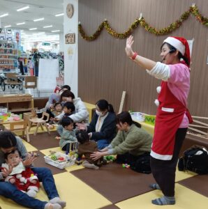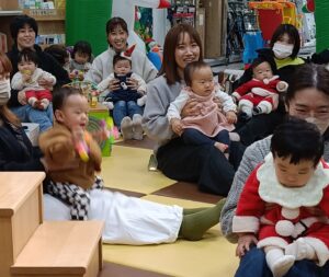 わらべうたやふれあい遊び、クリスマスバージョンの手遊び、そして最後は「ジングルベルロック」で親子一緒にダンスタイム。