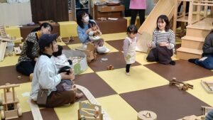 普段は、ひだっこランドにない、木っずテラスで人気の木のおもちゃがいっぱい並び、子どもたちは思い思いに遊んでいました。