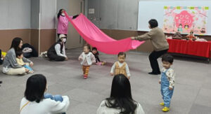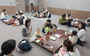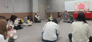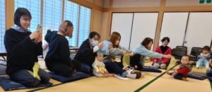 今回は、わらべうた遊びや親子ふれあいストレッチ、がんどうち(飛騨のひなまつり)体験などを行いました。