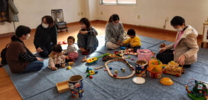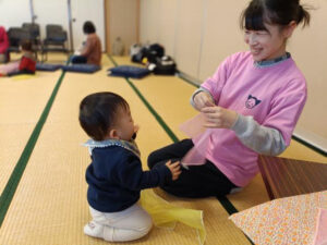 もうすぐ2歳になるお子さんと1歳のお子さんが一緒になり、異年齢の関わりも見られました。