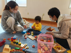 久しぶりに参加してくれたお子さんは、はじめはお母さんのそばで過ごしていましたが、スタッフがおもちゃを用意する中で少しずつ場に慣れ、最後はニコニコでお片付けまでしてくれました☺